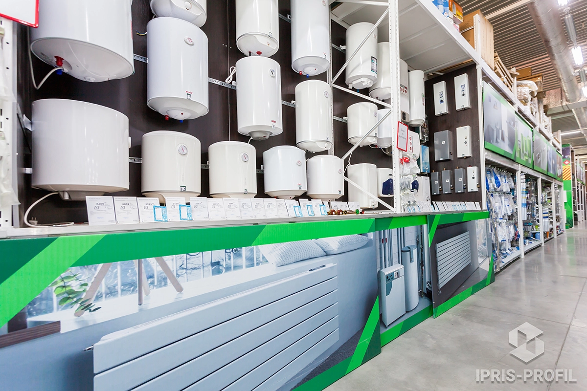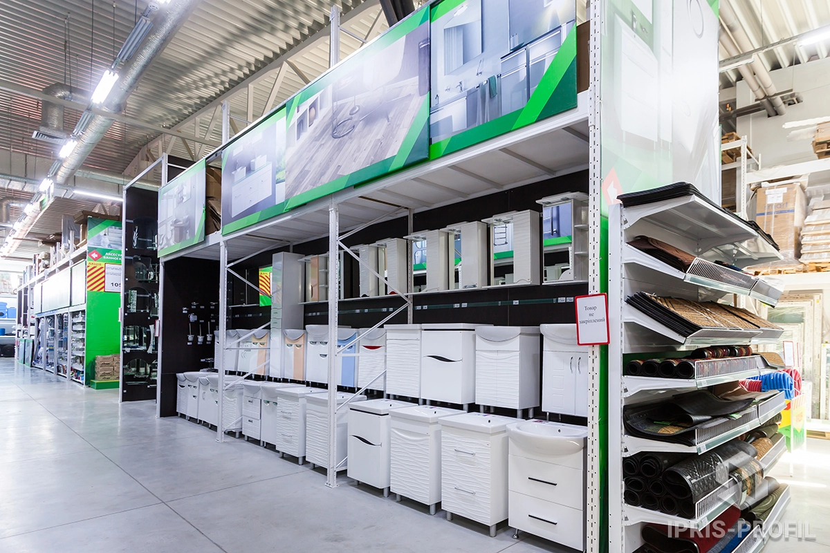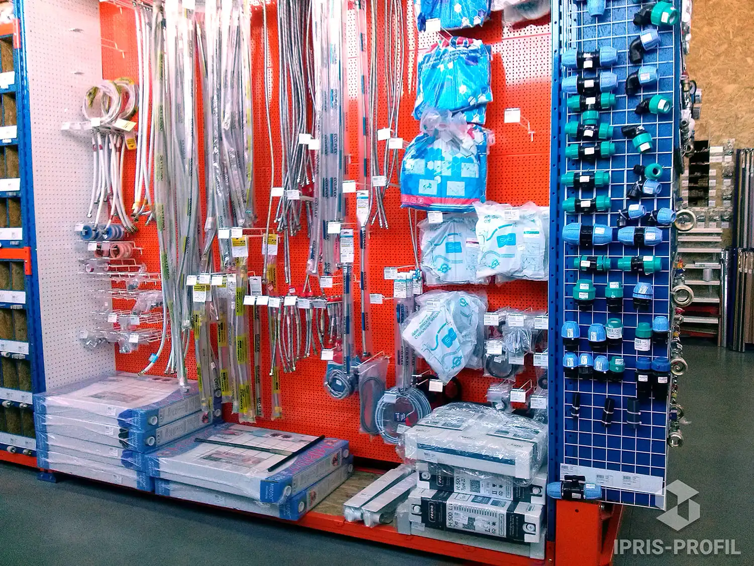 IPRIS-PROFIL, a manufacturer of commercial equipment for displaying sanitary ware in hardware stores, offers customised solutions for displaying goods in building materials stores and commercial exhibition halls, including vertical and horizontal display cases, combined systems with internal storage areas, and custom-made shelving for sanitary ware.